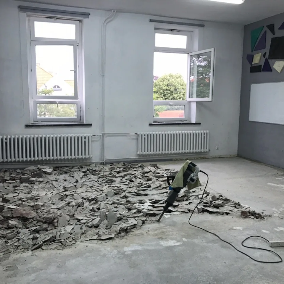 Prace obejmują zarówno demontaż starych elementów wykończenia, jak i przygotowanie przestrzeni do dalszych robót remontowych lub wykończeniowych.